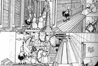 Senza passare in rassegna la produzione dell’epoca, notiamo ad esempio come Caniff (Terry and the Pirates) utilizzi a più riprese un montaggio che alterna campi lunghi a piani ravvicinati, campo e controcampo, utilizzo della profondità, raccordi sullo sguardo; o come Eisner proponga, in sintonia col genere poliziesco di The Spirit, inquadrature angolate, azione frenetica e paesaggi notturni in cui si dimostra maestro con le sue enormi superfici nere.