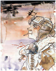 FS: …al “Sgt. Kirk” e ad “Ernie Pike”: siamo a cavallo tra il 1957 ed il 1958, sono passati molti anni da Ray Kitt, Pratt ha fatto molta esperienza ed è già un disegnatore maturo e molto, molto bravo. Qui ha già messo a punto la sua sintesi artistica in un meraviglioso equilibrio di bianchi e di neri, in un tratto molto dinamico e dettagliatamente realistico. A proposito di Ernie Pike, è importante notare che in questi fumetti di guerra, al contrario di quanto avveniva su quelli della Fleetway (per la quale anche Hugo Pratt lavorerà), il nemico, il cattivo, non è fortemente stereotipato in negativo, ma viene rappresentato nella sua umanità e normalità: non è un mostro da demonizzare ed abbattere sempre ed a tutti i costi, ma viene rappresentato in tutte le sue sfaccettature di essere umano che si trova a vivere una guerra.