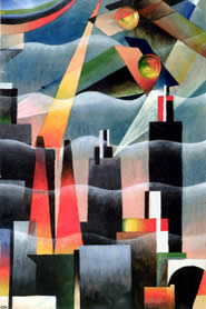 Protagonisti assoluti dei dipinti di questo periodo sono gli aerei che dall’alto scandagliano la vita di ogni giorno e se ne astraggono nella luce pura dell’etere; al di fuori dei tortuosi reticoli urbani delle grandi città, esaltate come i centri del movimento e viste attraverso gli squarci luminosi che spalancano il quadro, viene messa a nudo un’originalità e una forza rappresentativa mai prima visti.