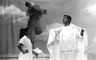 GD: Il rapporto con l’infermiera è molto importante. È sì un rapporto di comico e spalla, ma al tempo stesso lei incarna anche la credulità popolare e l’ingenuità: rispecchia un po’ tutte quelle persone che vogliono sapere e spesso fanno domande a sproposito…Che poi, in fondo, tanto a sproposito non sono, perché alla base c’è sempre la vitale molla del “conoscere”. Giada, infatti, ha proprio il compito di mettere il pubblico nella condizione di sentirsi “rilassato” nei confronti della narrazione, perché lo spettatore s’immedesima e pensa: “Ecco, vedi, non lo sa neanche lei chi è questo personaggio o cosa ha fatto Tiresia”; anzi, all’inizio Giada dice una delle battute più fantastiche: “Edipo? Chi, quello che ha ucciso il papà ed è andato a letto con la mamma?” Ed io: “Sì…Ridotto all’osso!”.