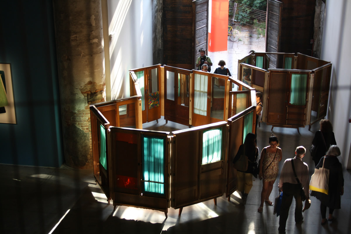 C’è una ragione per cui la Signora Biennale ha l’articolo determinativo e non serve specificare che da giugno a novembre sia Venezia a mettere in mostra le migliori conoscenze. Oltreoceano: il padiglione Venezuela, Espacios, pensato appositamente per l’occasione: una stanza allestita su tre facciate, con icone adattate alla moda contemporanea: Ratzinger con in braccio Joker, la Medusa del Caravaggio stile hip hop, Obama nudo e narciso; nella camera di fronte una spirale bianca di carta che potrebbe continuare a volteggiare all’infinito.