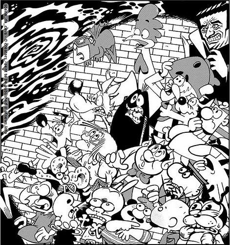 Mi sono imbattuto, nel flusso dei commenti di Facebook, in un breve scambio di battute tra Jay Lynch ed altri amici scaturite da queste video-note del fumettista serbo, in cui sono emerse interessanti prospettive di riflessione, che ripropongo. Un storia del genere non è pertinente al pensiero razionale e non è sostenuta da un saldo scheletro costruito con le precise tecniche del mestiere di raccontare; non poggia su una struttura ragionata, ma sulla giustapposizione di “poesie visuali”, di brevi lampi sinestetici eruttati dalle viscere, singoli tasselli incastrati in un unico flusso, come beat pulsanti che compongono una sinfonia ottica improvvisata e coinvolgente. Molti dei piccoli scompartimenti di questo treno di vignette sono opere molto aperte e simboliche, dal valore fortemente connotativo ed evocativo, e lo sguardo soggettivo dello spettatore, di fronte ai singoli riquadri così come a tutto l’unicum, gioca un ruolo molto importante nell’interpretazione del senso e nel rintracciare possibili livelli di lettura e corrispondenze, anche intra e intertestuali.