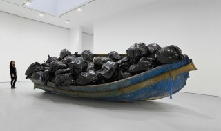 Décor, (2011-2012) è la successione di 4 enormi cristi crocifissi realizzati con fil di ferro e lamette. L’unicità sacrale dell’immagine del crocifisso (l’unicità e trinità di Dio è uno dei più importanti dogmi del cristianesimo) viene qui sconfitta dalla riproduzione seriale. Hope è l’inquietante barcone colmo di sacchi della spazzatura, metafora delle traversate che i migranti fanno per raggiungere l’Europa, che fluttua nel vuoto e sembra cercare invano le rive di un immaginario a cui approdare.