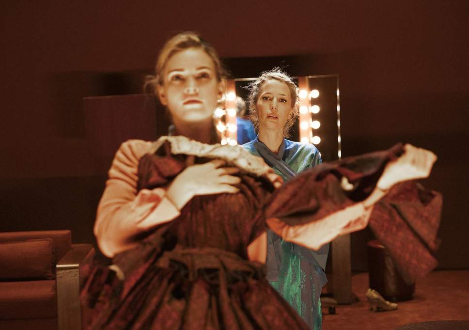 Poi, quando Margo entra per la prima volta in scena, le pareti rosa si alzano fino a scomparire e si vede l’intero backstage fino alle pareti del teatro. Questo grande gesto teatrale mette in risalto le due tematiche principali che imbevono il dramma. La prima è che, per i personaggi della pièce, e soprattutto per un personaggio famoso come Margo Channing, non esiste alcuna distinzione tra pubblico e privato. Proprio come nell’allestimento di van Hove di Uno sguardo dal ponte, nel 2014, che collocava il pubblico sui tre lati dello spazio recitativo, Margo e le persone che la circondano non hanno privacy. Non hanno un luogo dove ritirarsi. Van Hove posiziona i videografi perfino in cucina e nel bagno senza finestra, mostrando che in quanto gente di teatro sono sempre impegnati a recitare, anche nel privato, e alcuni, come Margo, hanno recitato talmente a lungo da dimenticare cosa sono le vere emozioni e le vere interazioni sociali. Per quanto riguarda le persone che circondano Margo, Eve è forse quella più falsa, ma in certa misura più o meno tutti ingannano Margo.